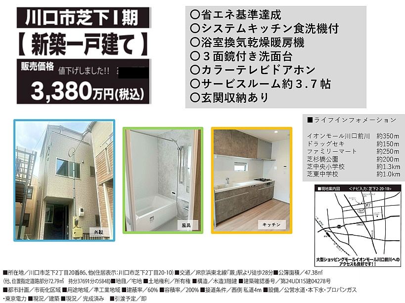 | 2025-10-20 | 価格変更物件~新築戸建~ ![]() ![]() ●完成済現場に付き、内覧可能です●JR蕨駅徒歩11分●通勤通学に快適アクセス ●住宅性能評価書において7項目取得●省エネ性能ラベル取得 ●子育てグリーン住宅にも対応しております |