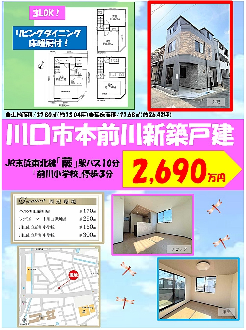 | 2025-10-09 | 新着情報~新築戸建~ 【川口市本前川 新築戸建 角地】 2690万円 ●月々7万円台のお支払い!住宅ローンの相談無料です! ●完成現場につき、内覧可能!ご予約受付中です。