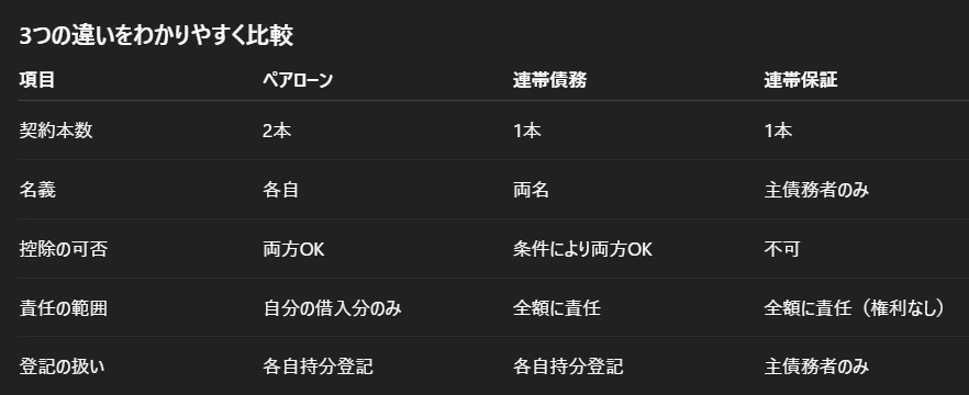 川口エリアでもよく聞かれるこの質問。実は「ペアローン」「連帯債務」「連帯保証」は似ているようで大きく違います。